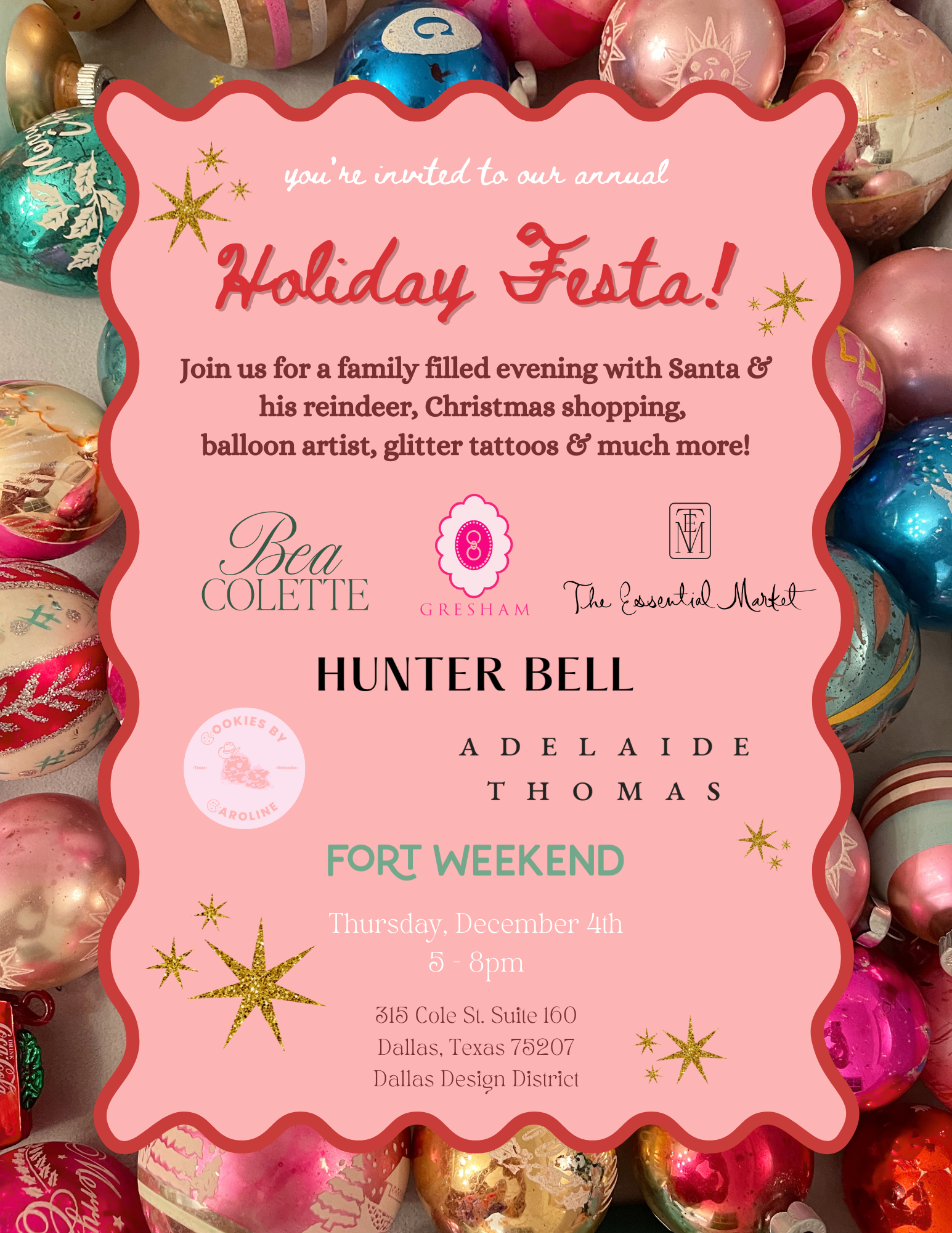 Your ticket price includes admission to the event with an OPEN BAR, food, photos with Santa & reindeer AND a donation to Austin Street Center, one of Dallas' largest homeless shelters.
